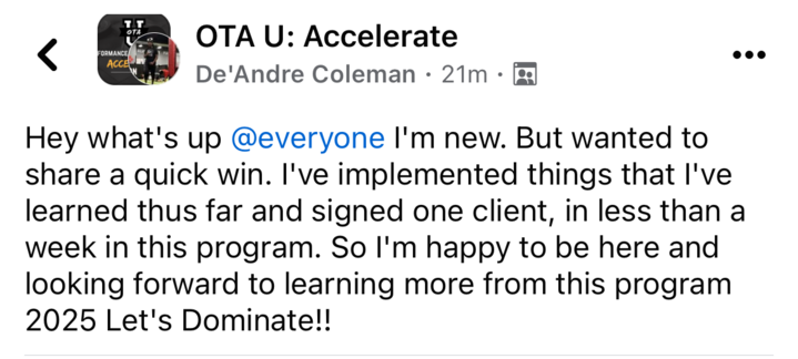 As part of the program, you'll have the opportunity to join up to three group calls each week, where you'll connect with other coaches in the program and our OTA team. These sessions are designed to provide you with dedicated time to ask any questions you may have about the course material, as well as to discuss strategies for implementing what you’re learning into your own business. This interactive support will ensure you have the guidance you need to successfully apply the concepts and ensure progress.